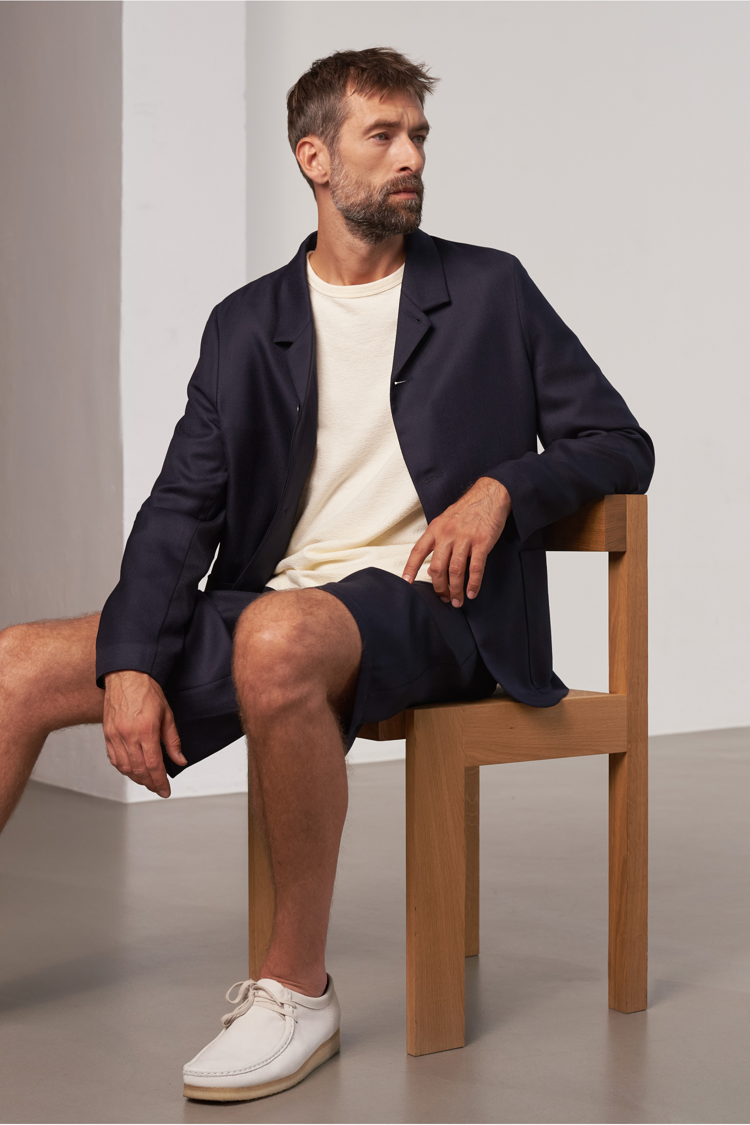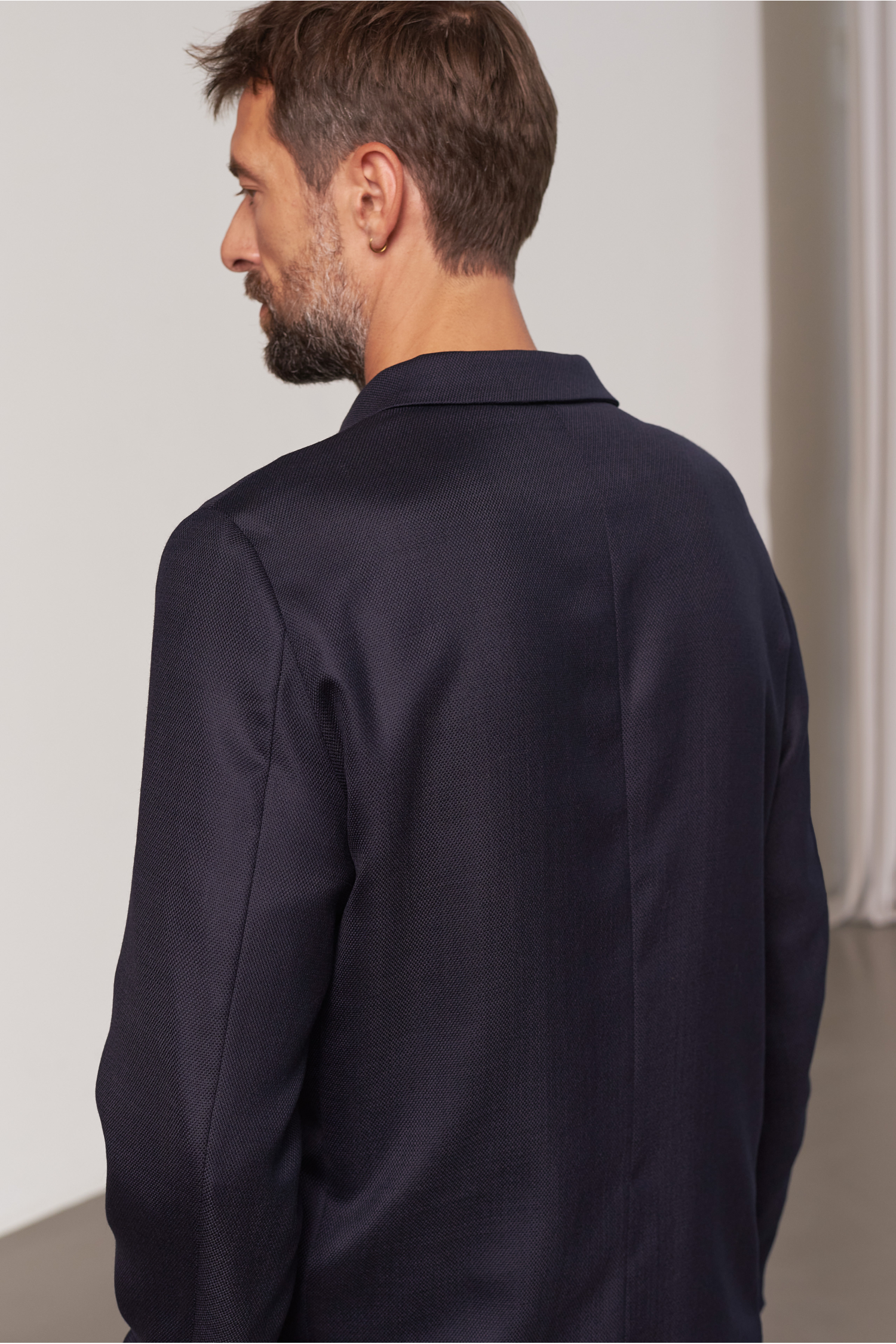 Casual fit button jacket made from a luxurious pure wool fabric with two patch pockets with hidden coin pocket, four inside pockets and corozo buttons, no padded shoulders. Worsted yarns in a panama weave make this fabric light and breezy for the summer. Easy to wear as a casual suit or everyday jacket.