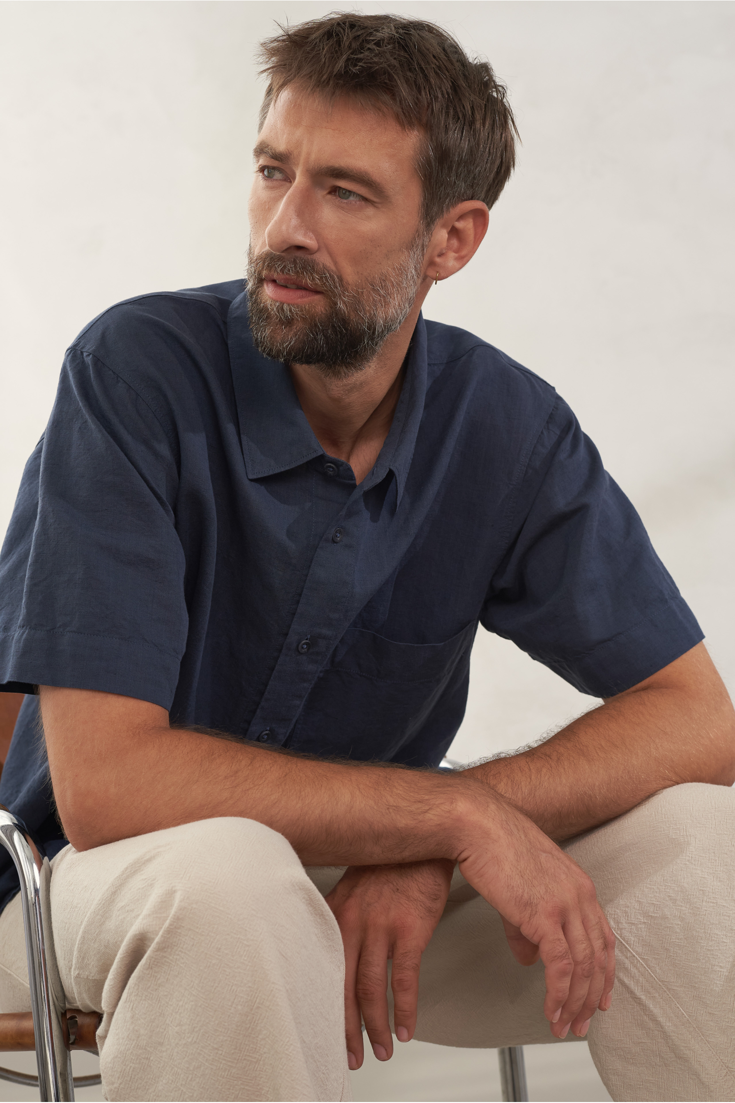 Relaxed short sleeve shirt made from a breezy linen blend with a chest pocket and vegan buttons.