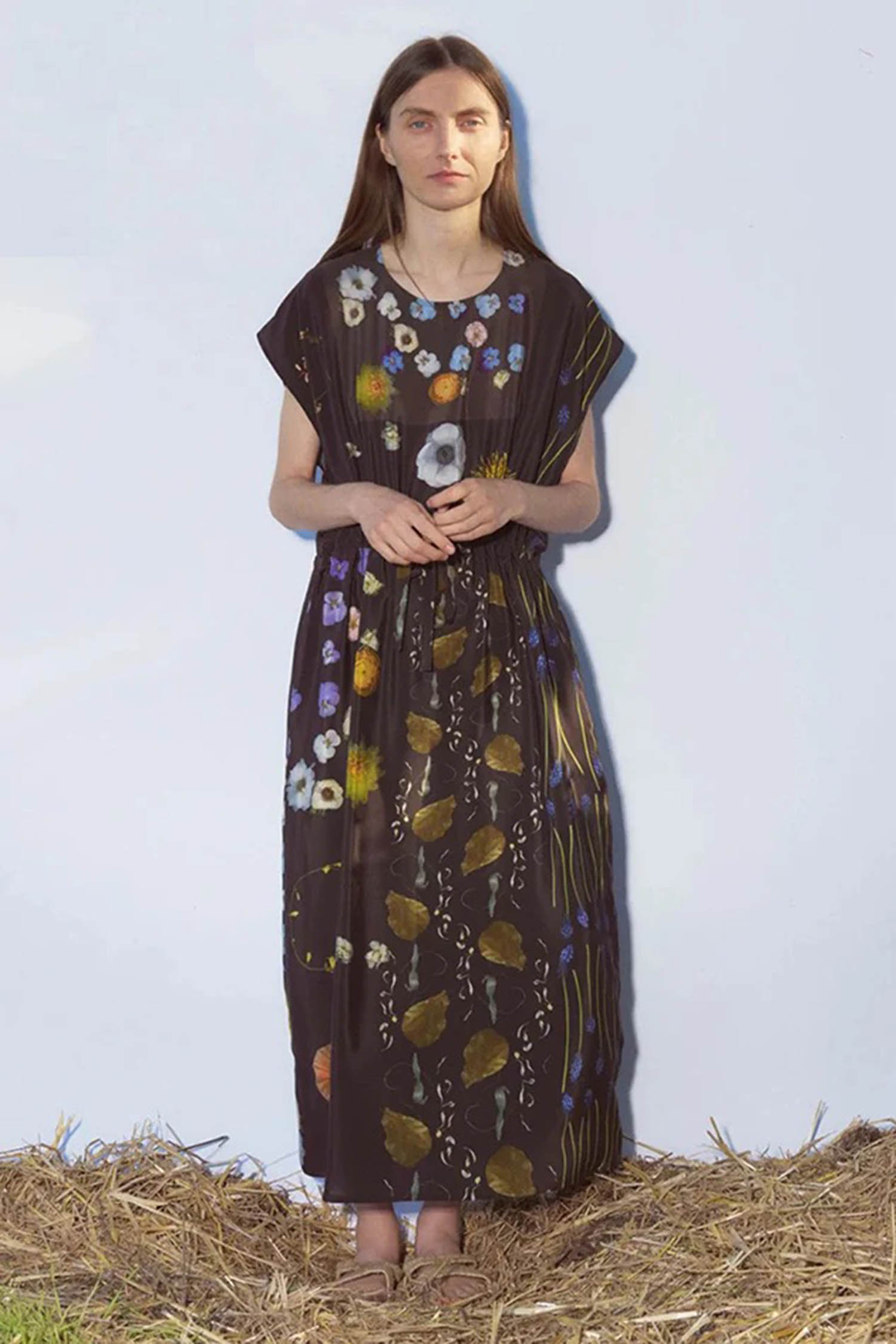 Schlichtes Seidenkleid mit Blumenprint, hergestellt aus 100 % Bio-Seide.