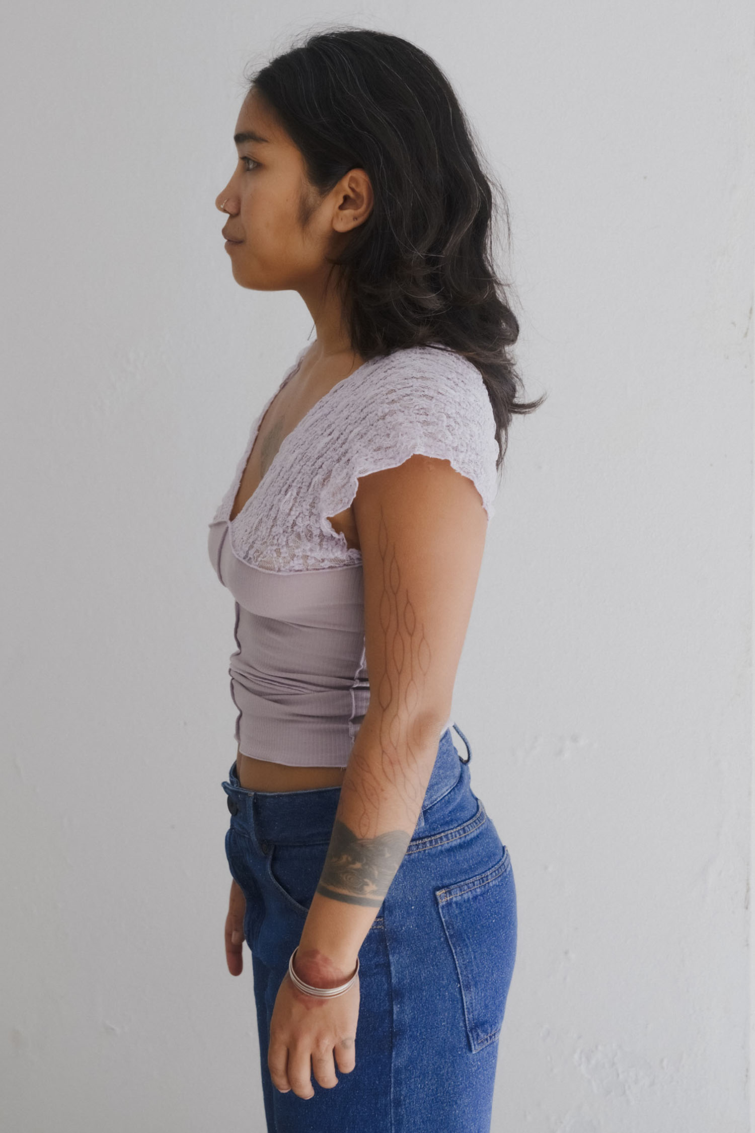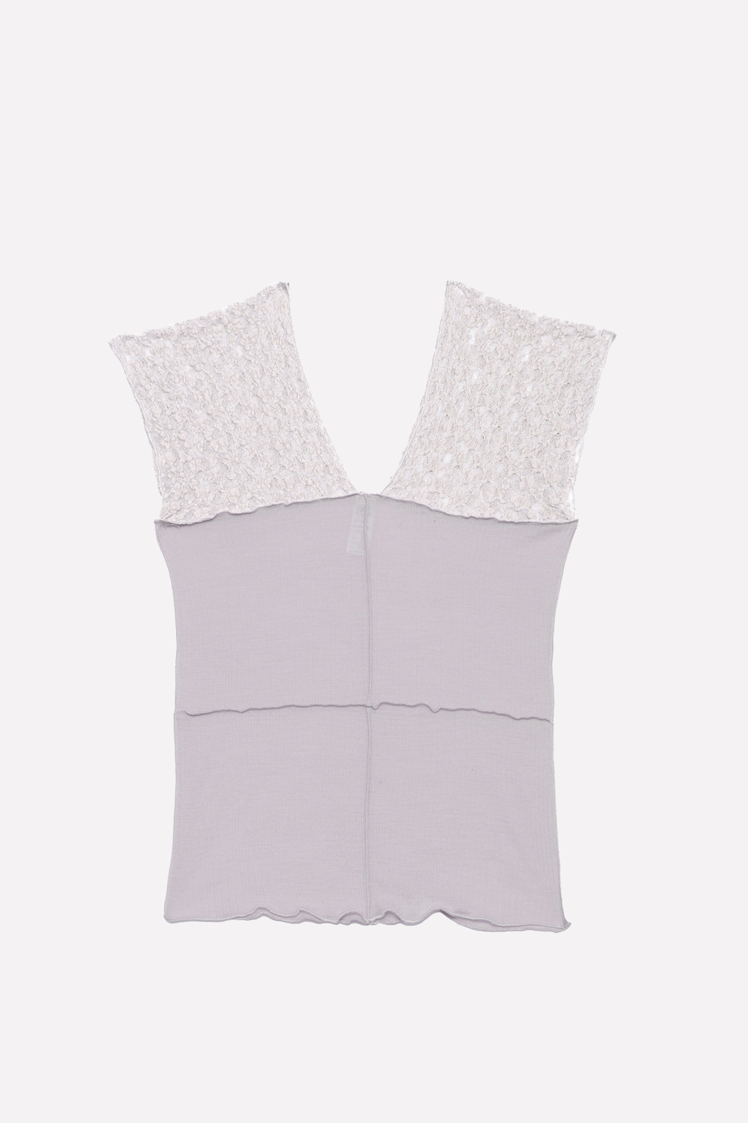 Tanktop aus Bio-Baumwollspitze, sichtbare Nähte, gewellter Saum. Das Model trägt Grösse S.