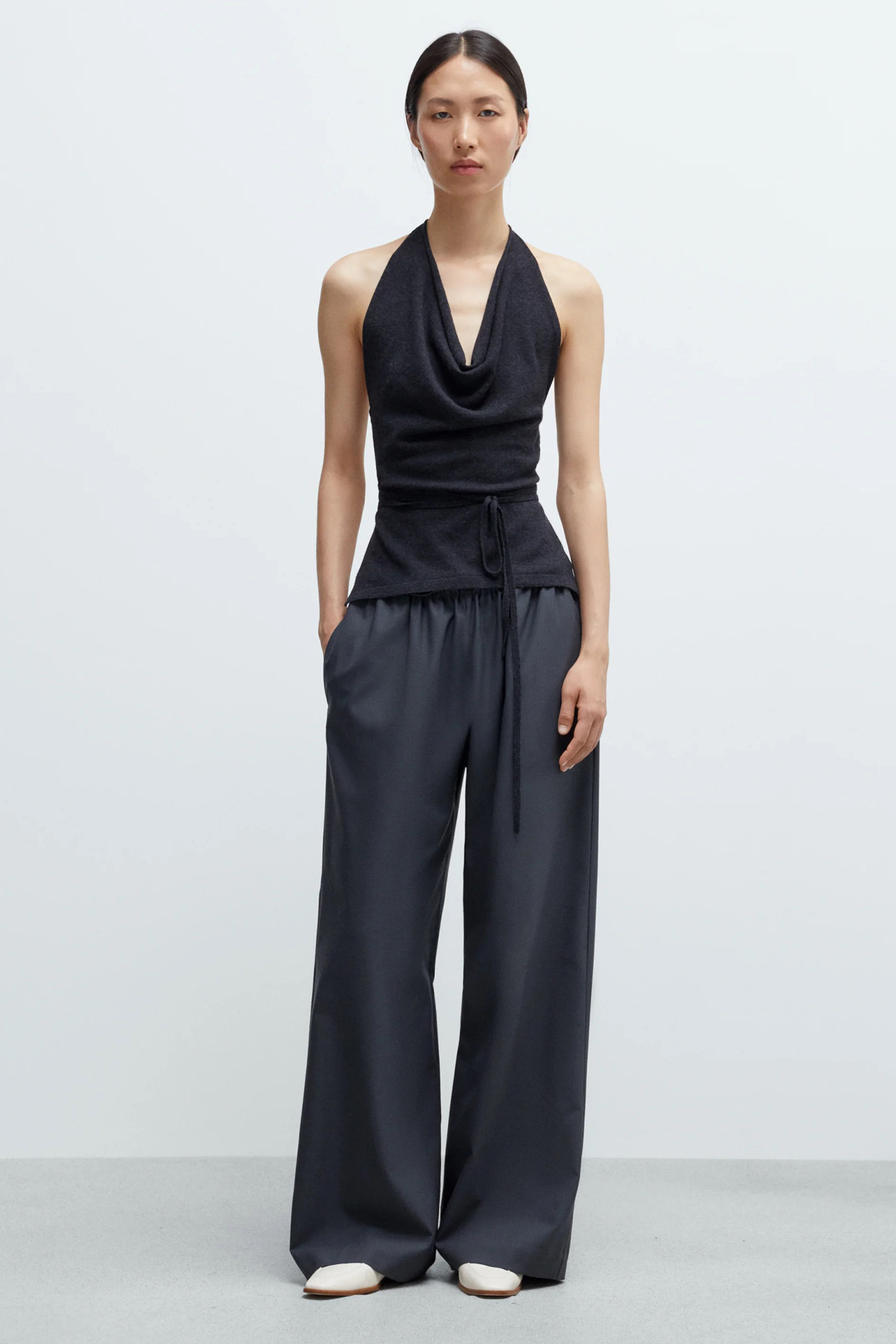 These tailored drawstring pants feature an oversized fit with a long length, designed for relaxed comfort and modern style. The fully elasticated waistband with adjustable drawstring ensures a perfect fit. It features vertical side pockets and two faux jetted pockets at the back complete the clean, streamlined look. A versatile piece that effortlessly blends tailored details with casual ease.