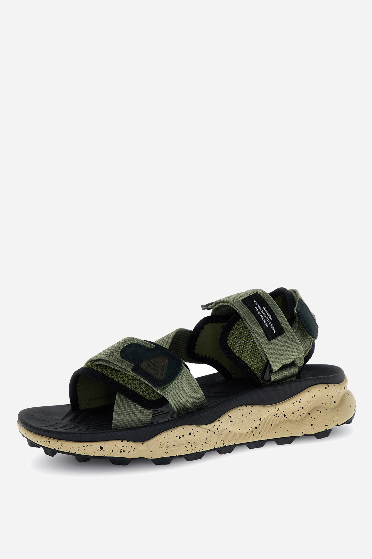 Halboffene Sandale aus Mikromesh und Nylonriemen. Klettverschlüsse und ultraleichte Gummisohle mit doppelter Dichte.