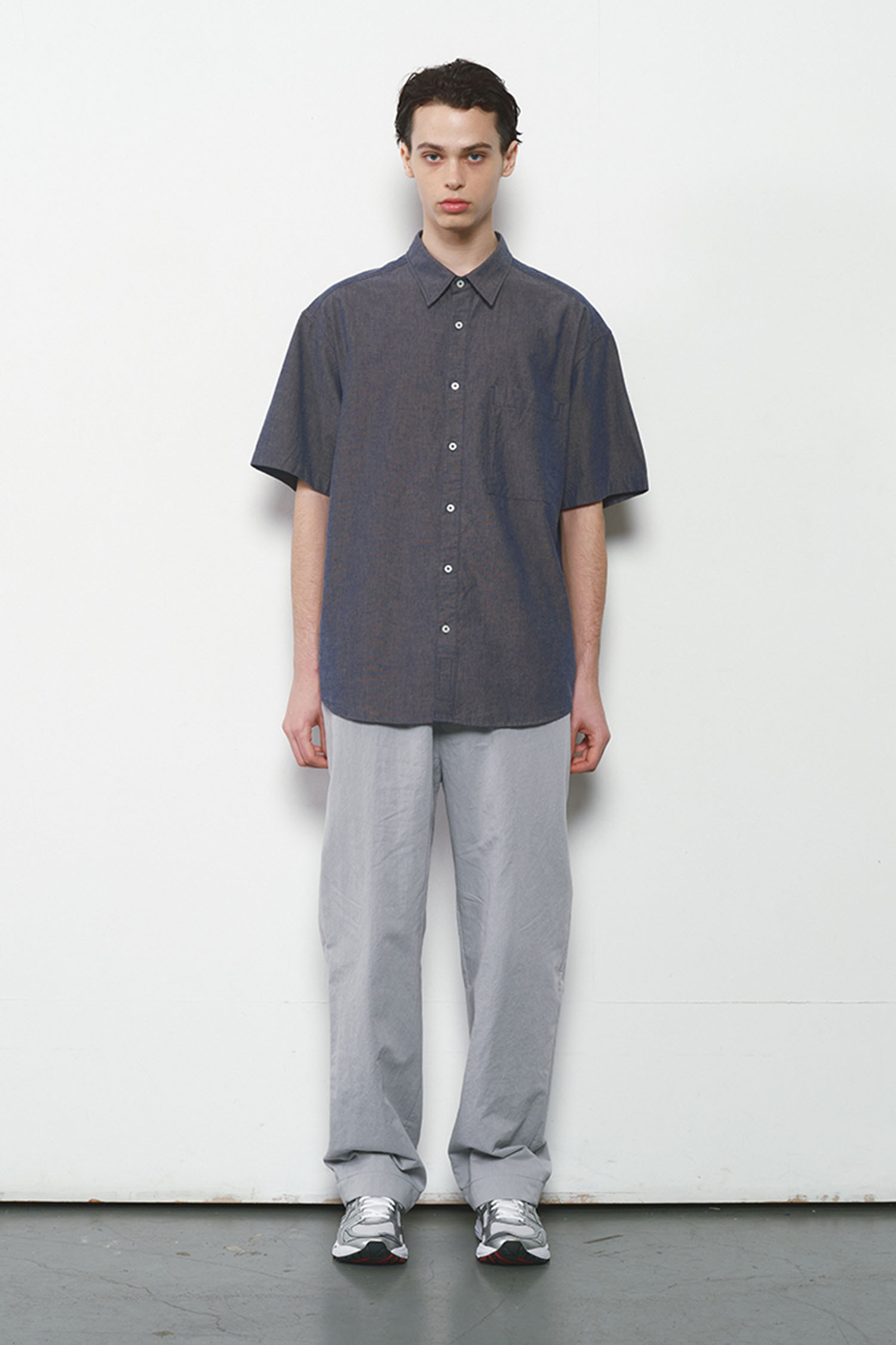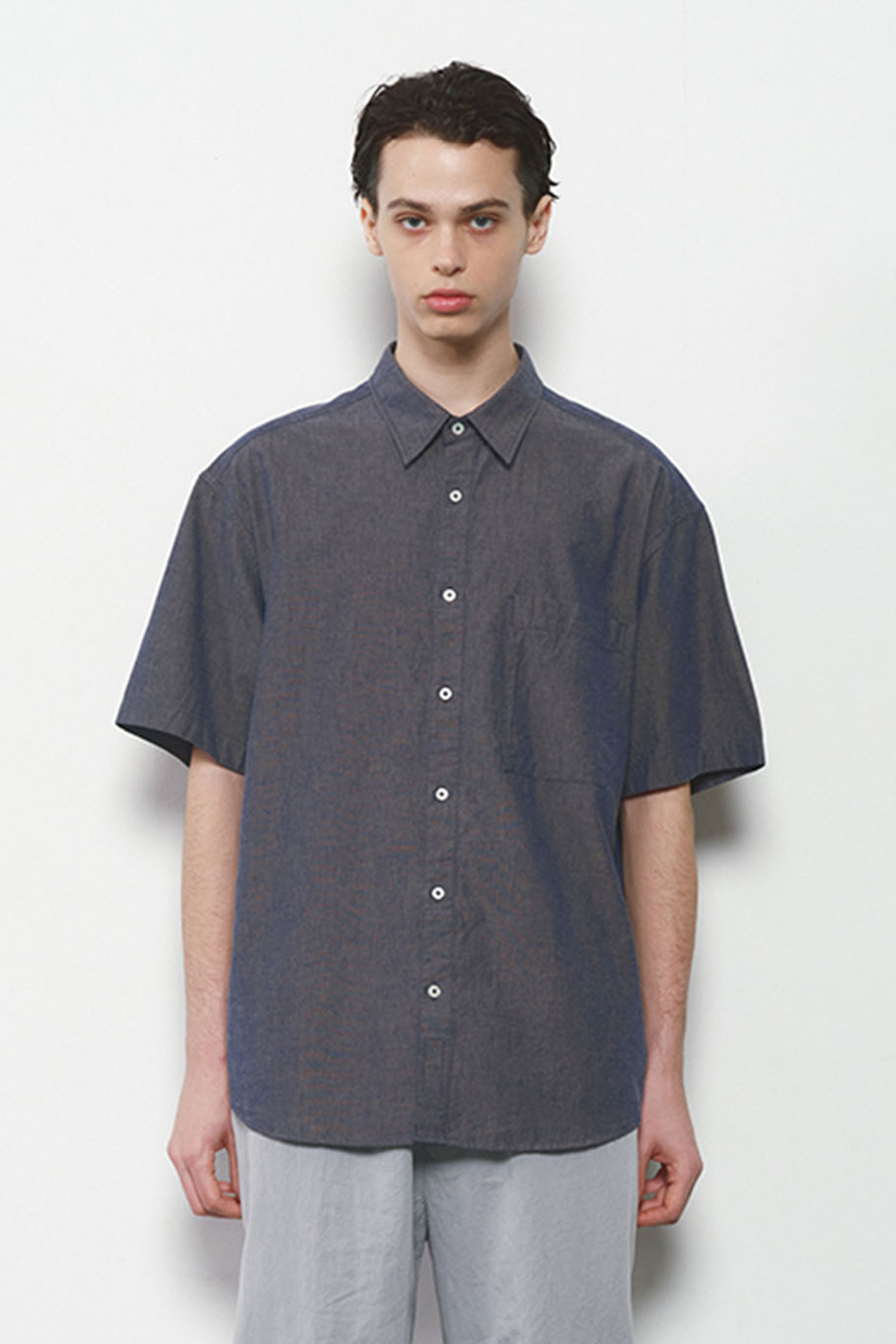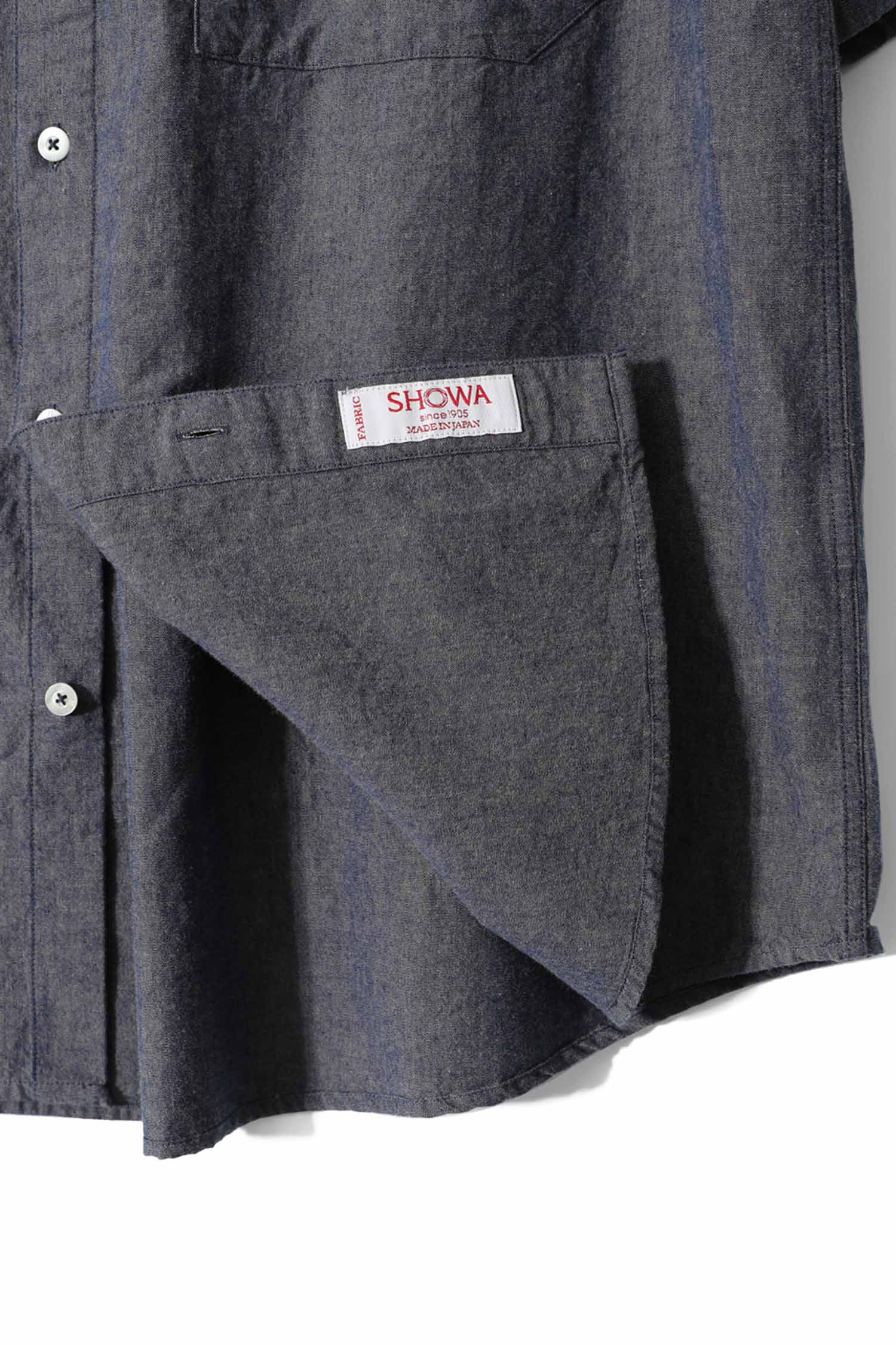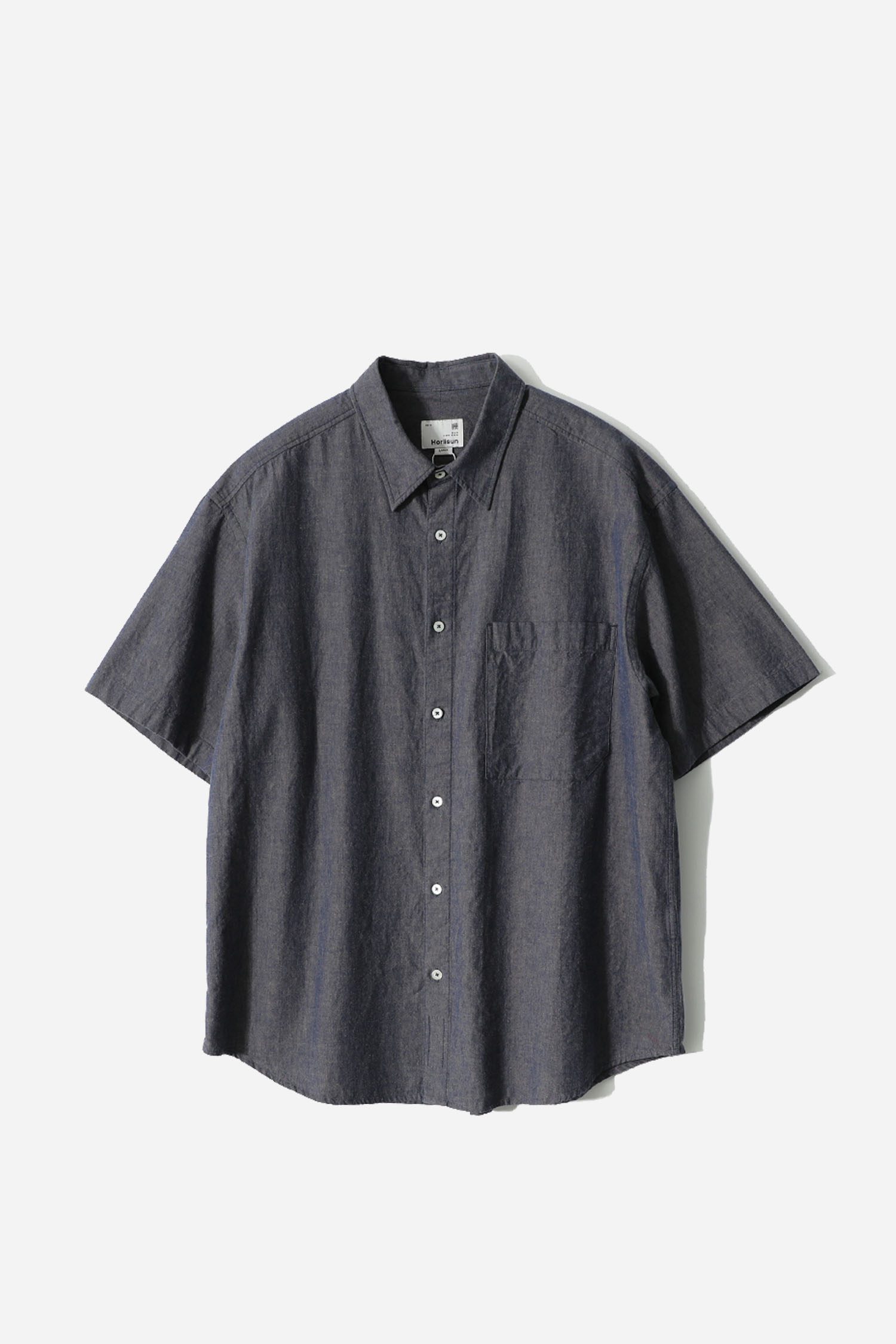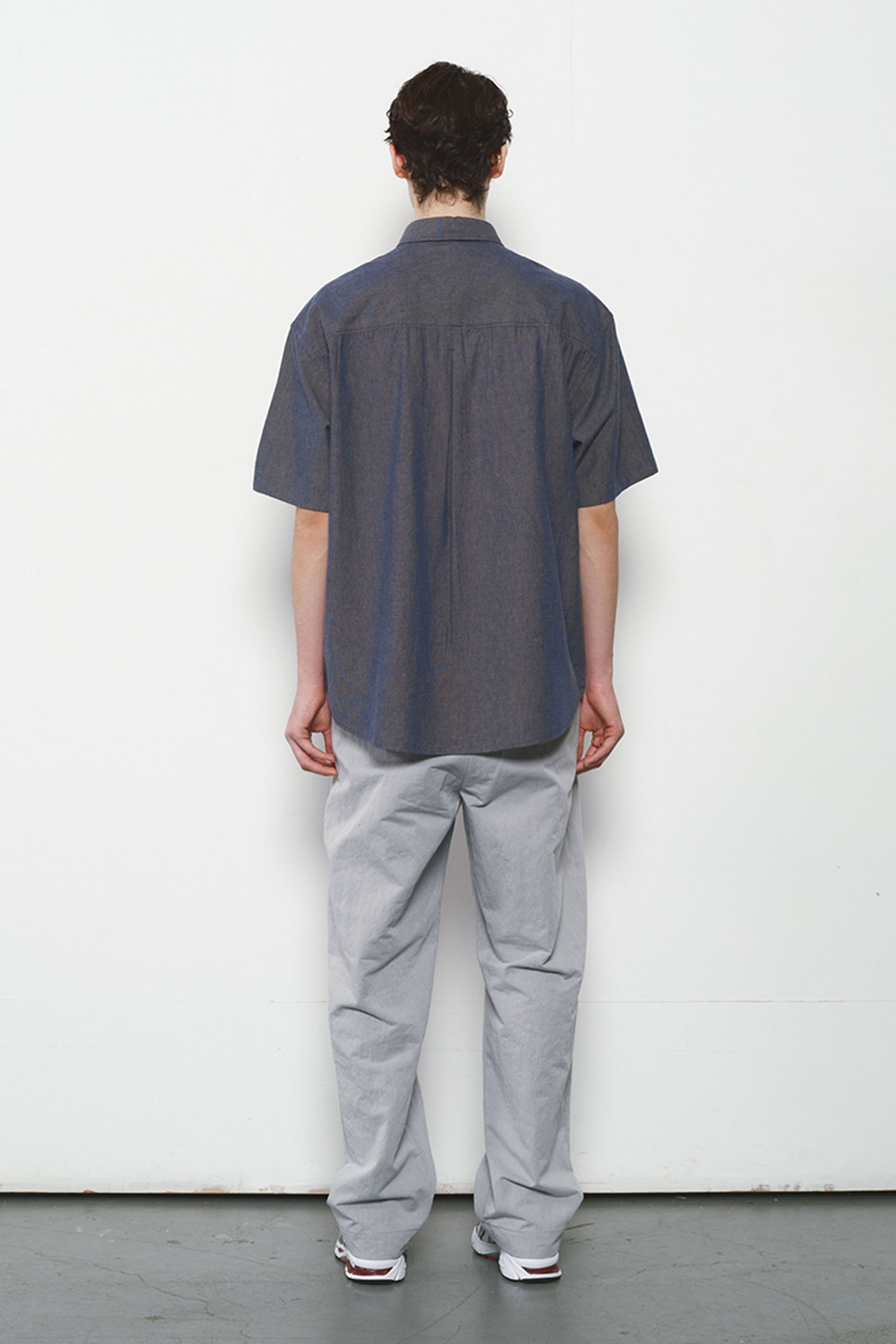 Okayama chambray fabric with soft texture and cool touch, ideal for summer. Garment-washed finish. Relaxed drop-shoulder fit with denim label detail.
