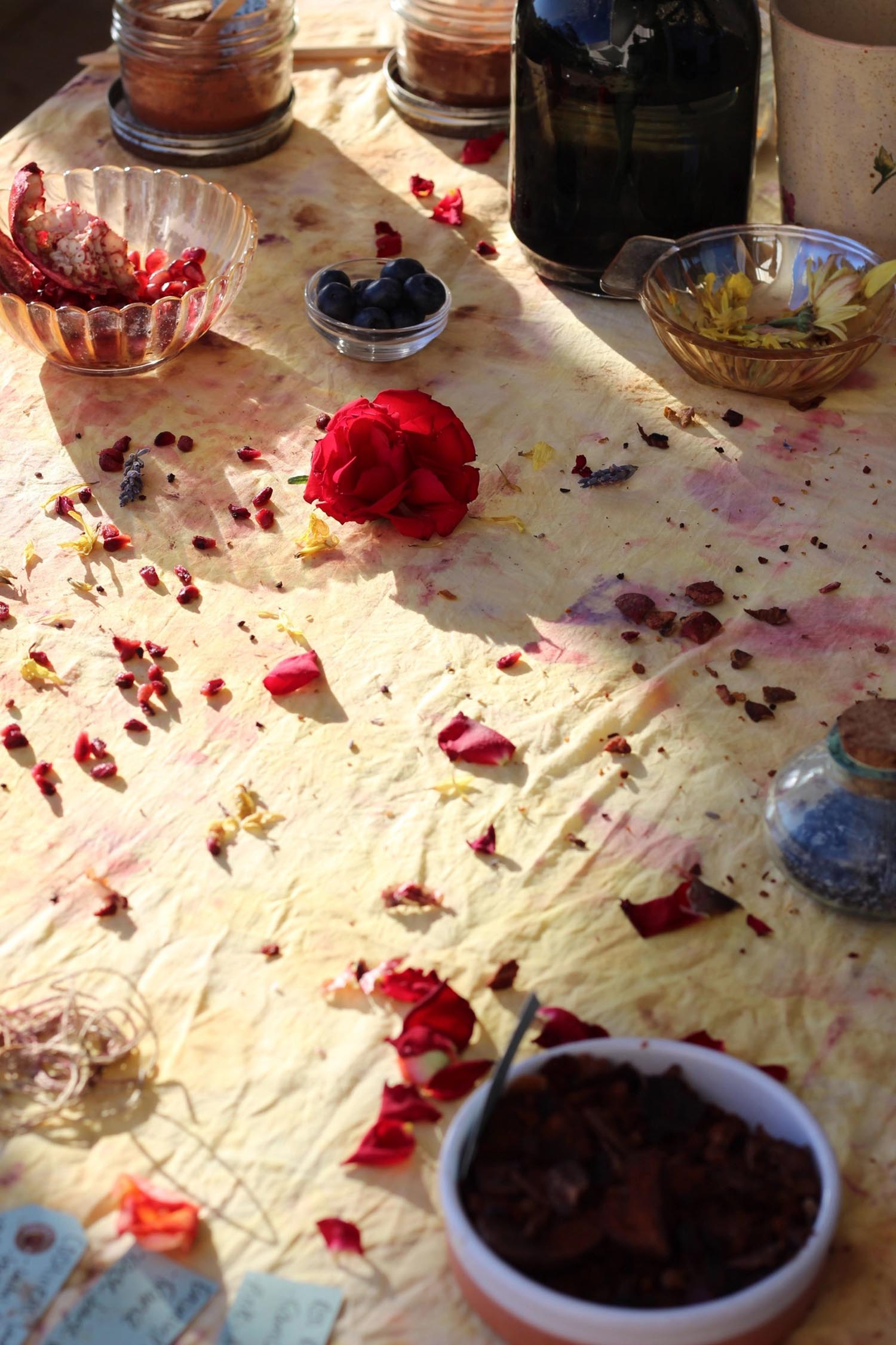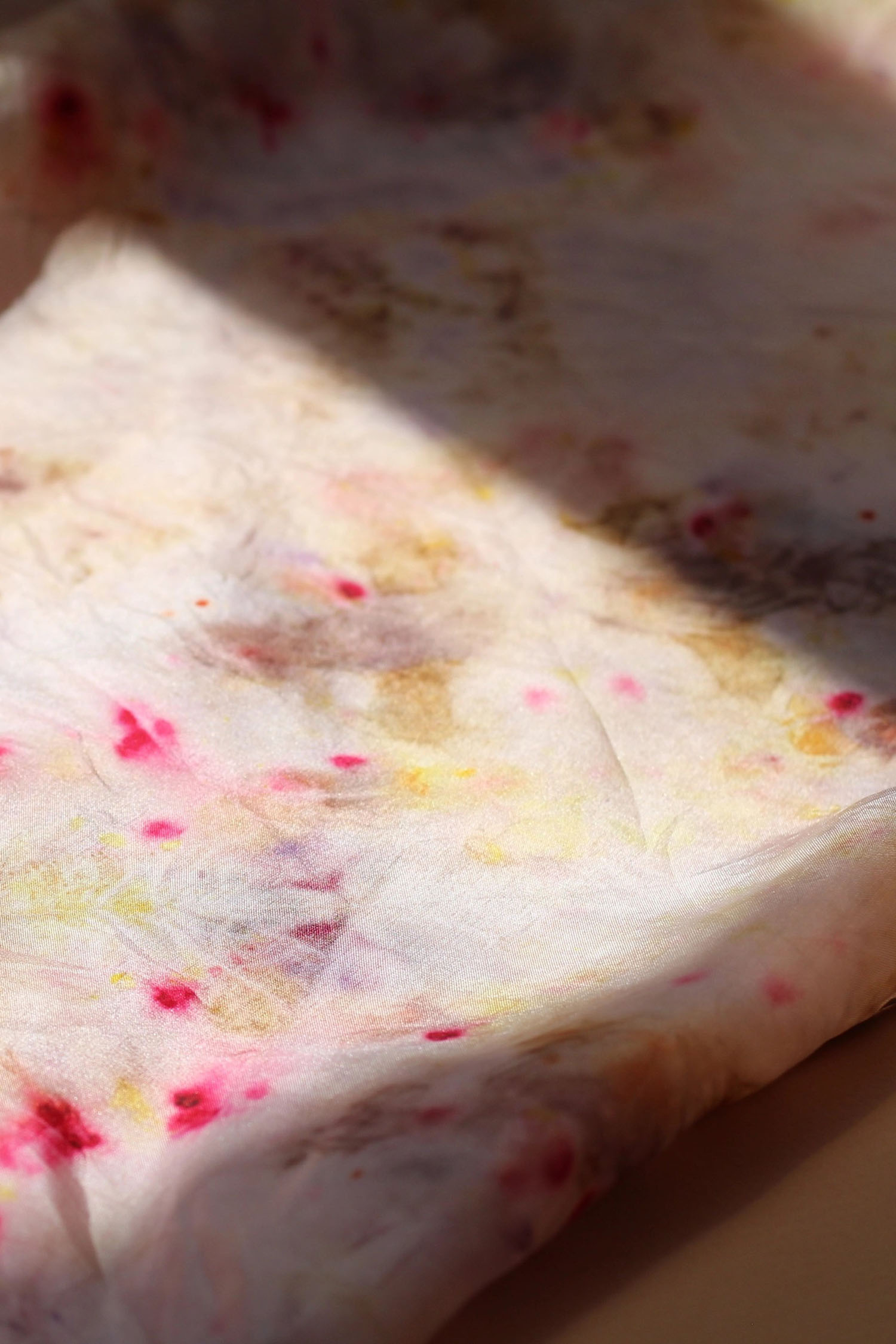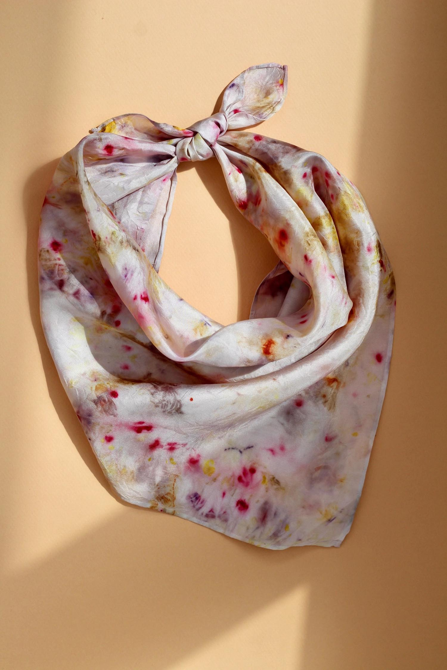 The silk is dyed by hand with a combination of plants, flowers, food waste and natural dye extracts to create a unique print on the fabric. Due to different dyeing processes, your item may not be identical to the one pictured.