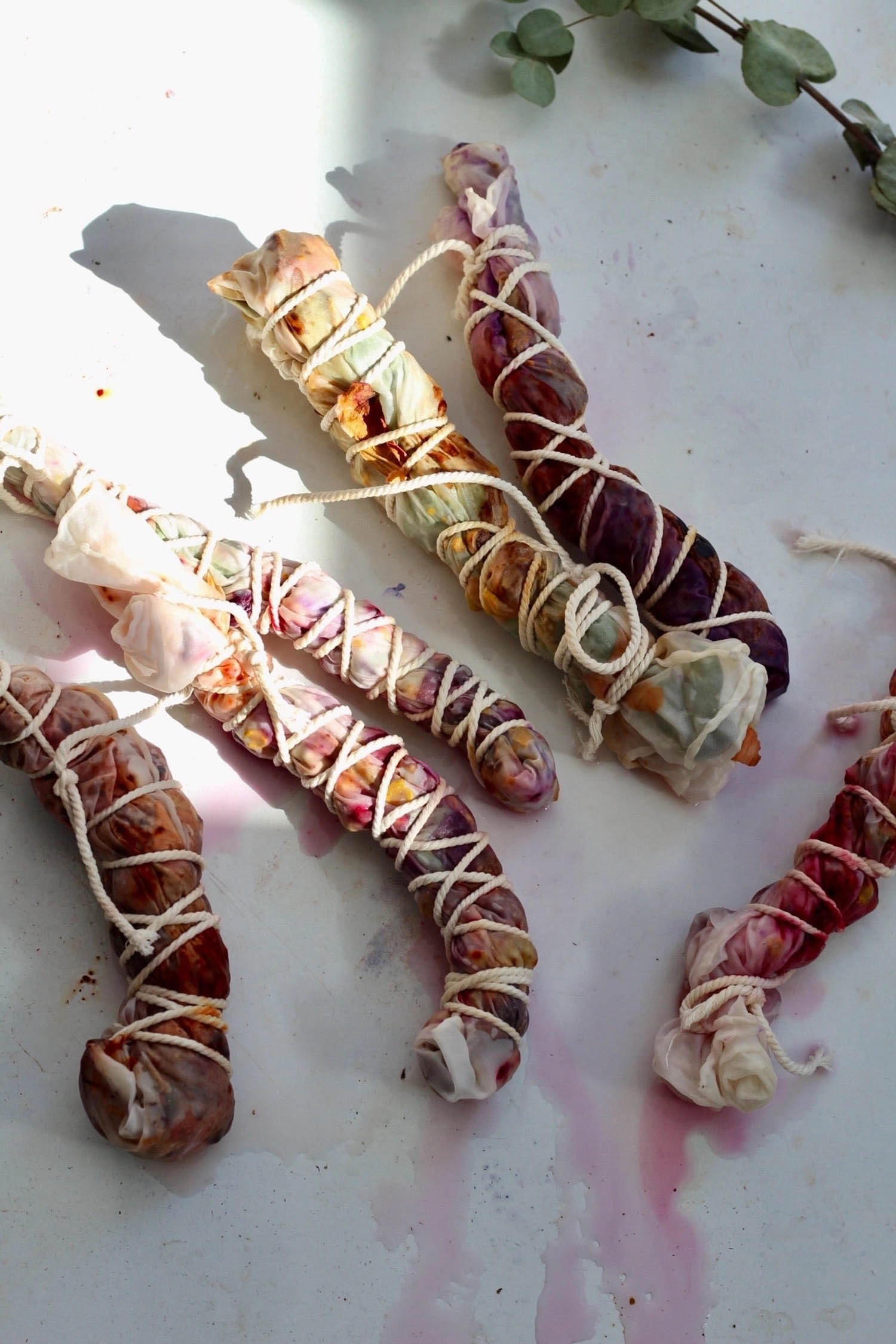 This unique silk scarf was dyed using the bundle dyeing method. In bundle dyeing, the dyes are applied directly to the selected fabric and their natural colours are extracted using heat and steam, transferring their imprints to the silk.