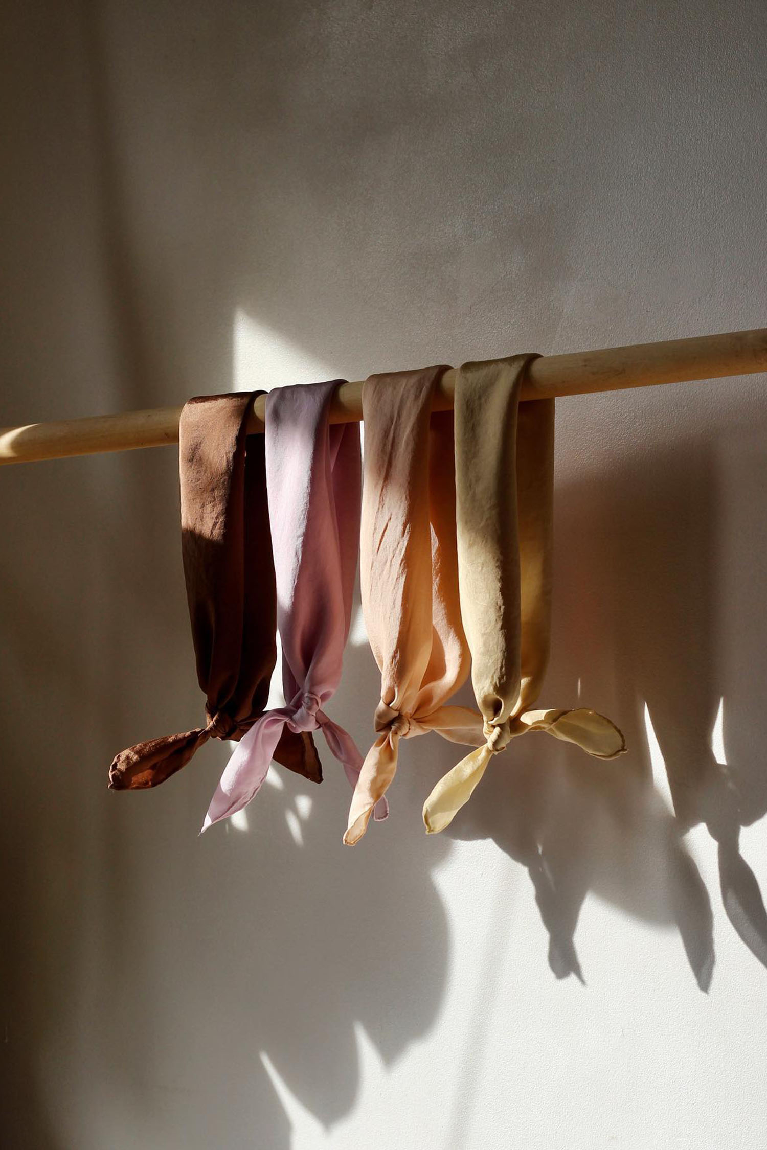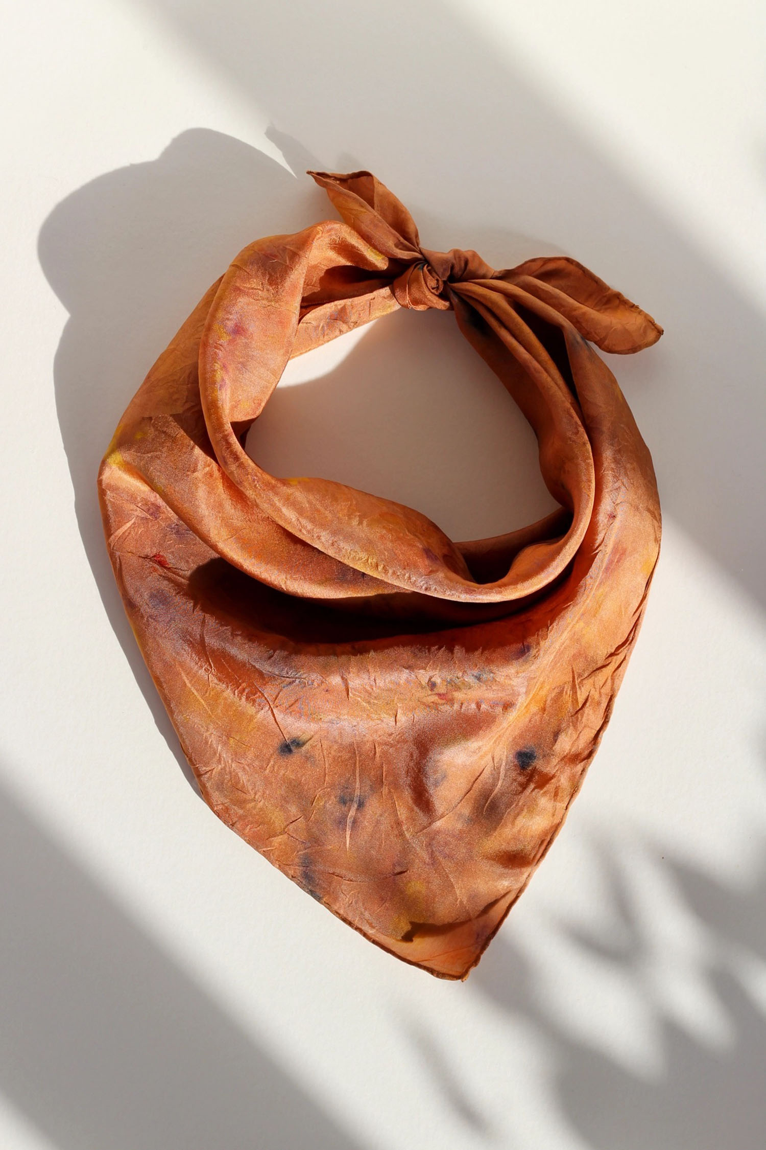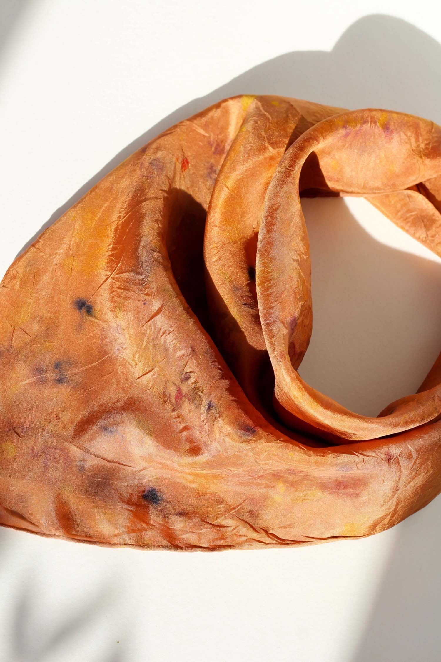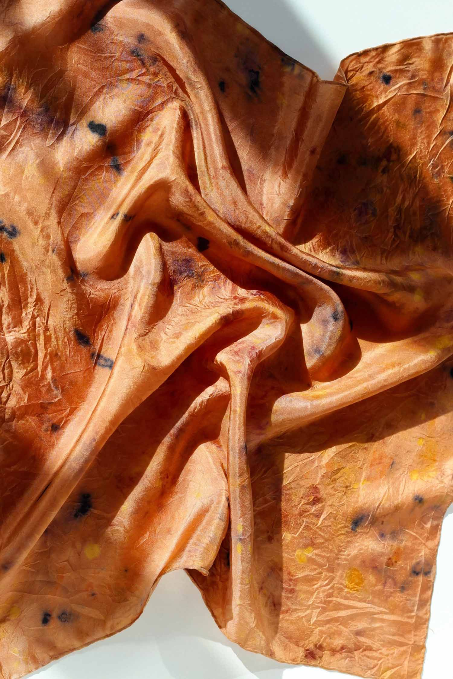This unique silk scarf was dyed using the bundle dyeing method. In bundle dyeing, the dyes are applied directly to the selected fabric and their natural colours are extracted using heat and steam, transferring their imprints to the silk.