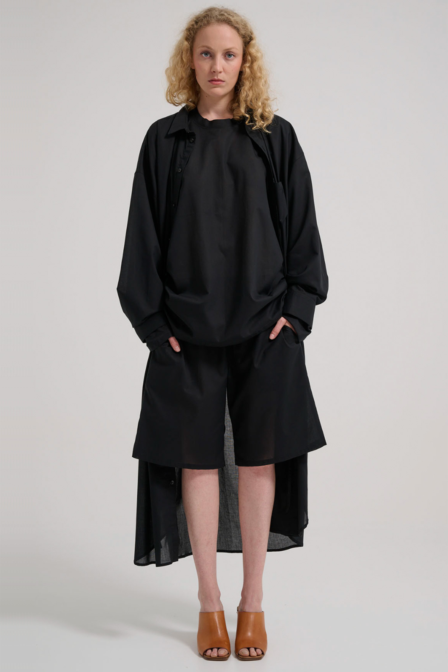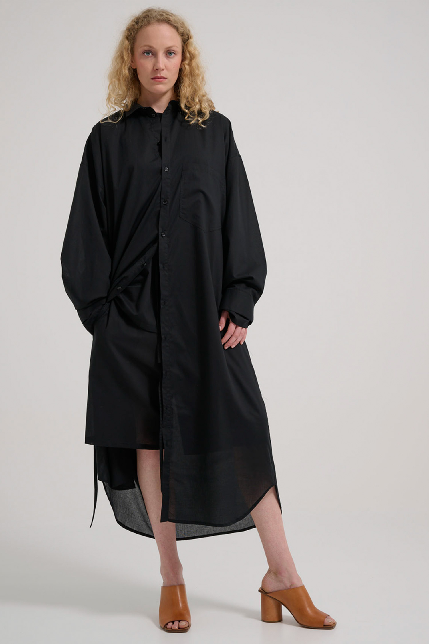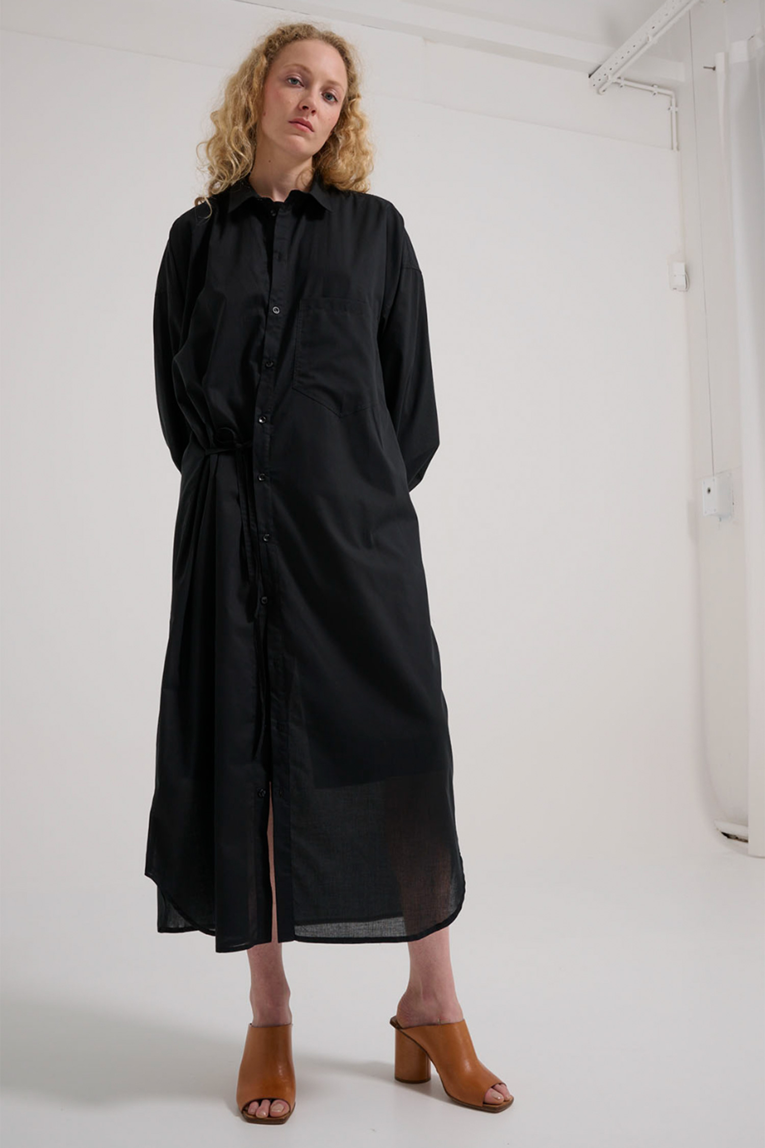 Blouse dress with long sleeves and a narrow belt.