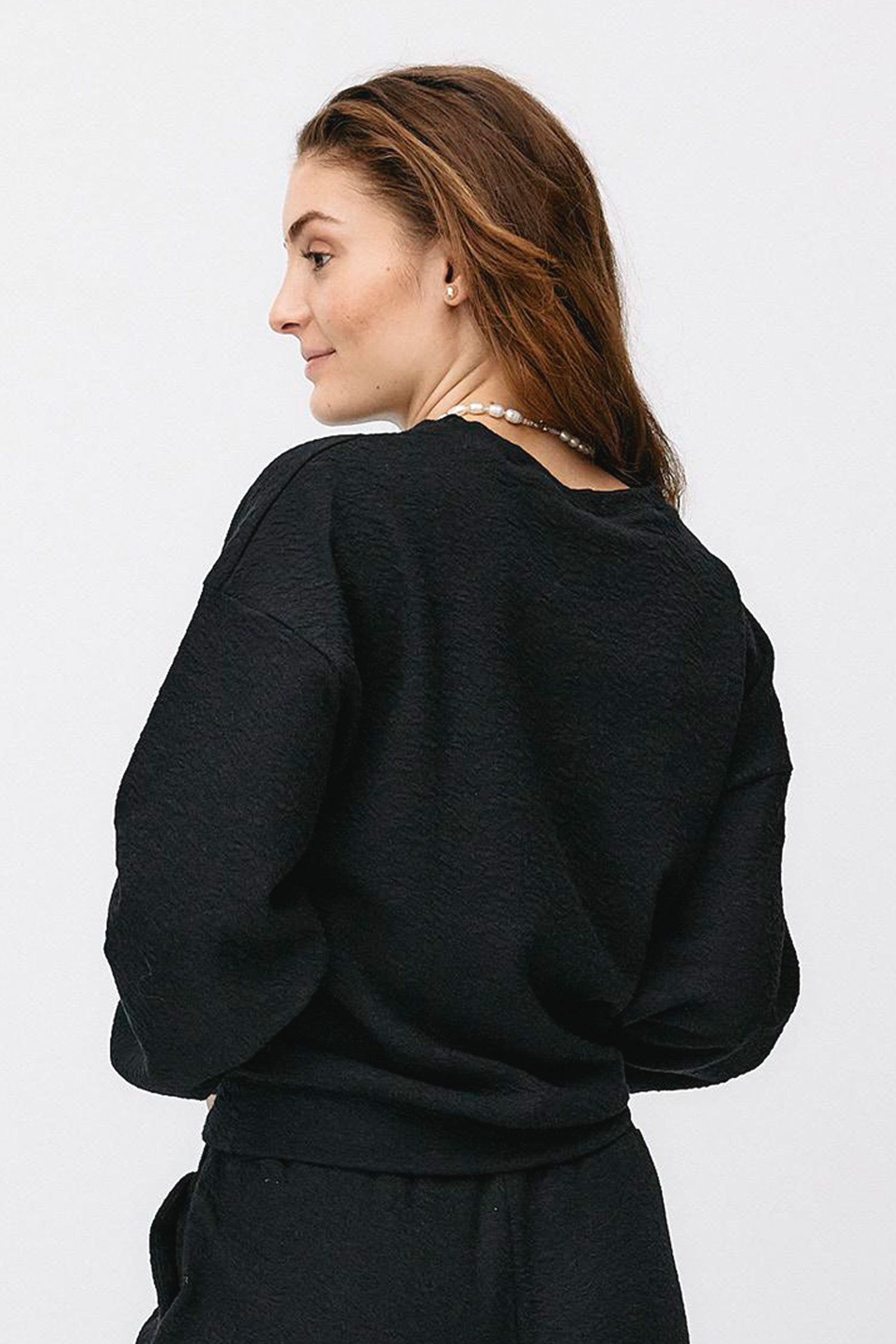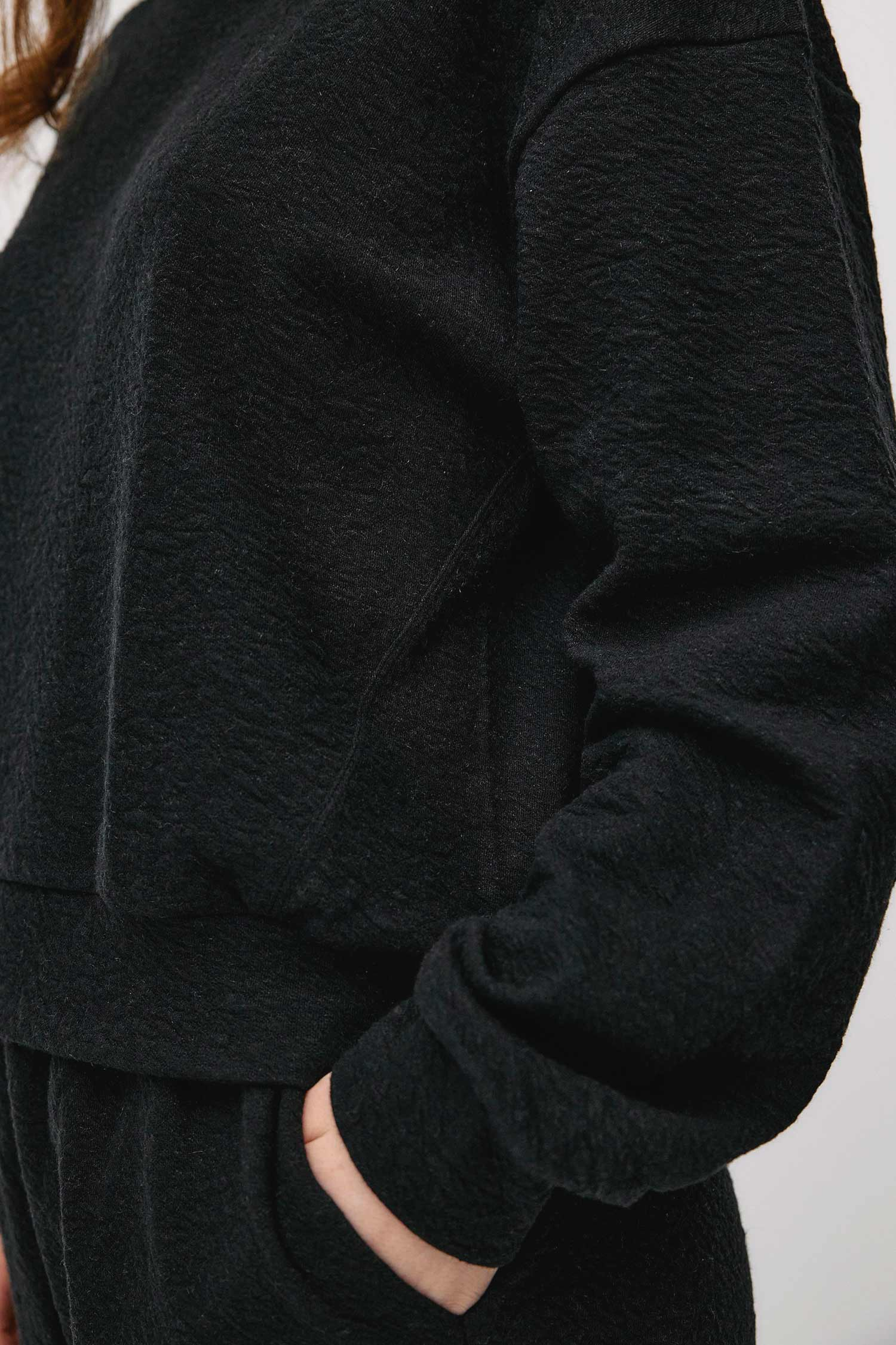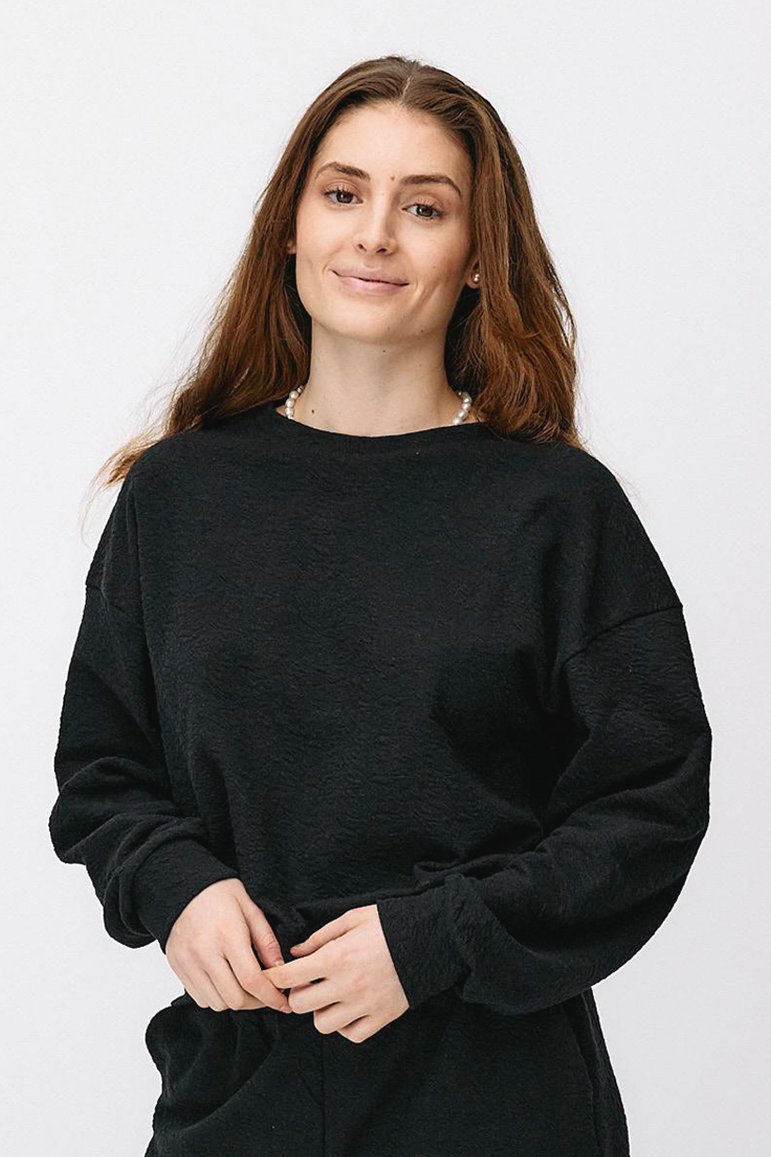 Ein gemütlicher, locker sitzender Pullover mit überschnittenen Schultern und breiten Bördchen an Ärmel und Saum. Der Interlock Jacquard aus Bio-Baumwolle und Brennnessel ist temperaturregulierend, antibakteriell und antistatisch.