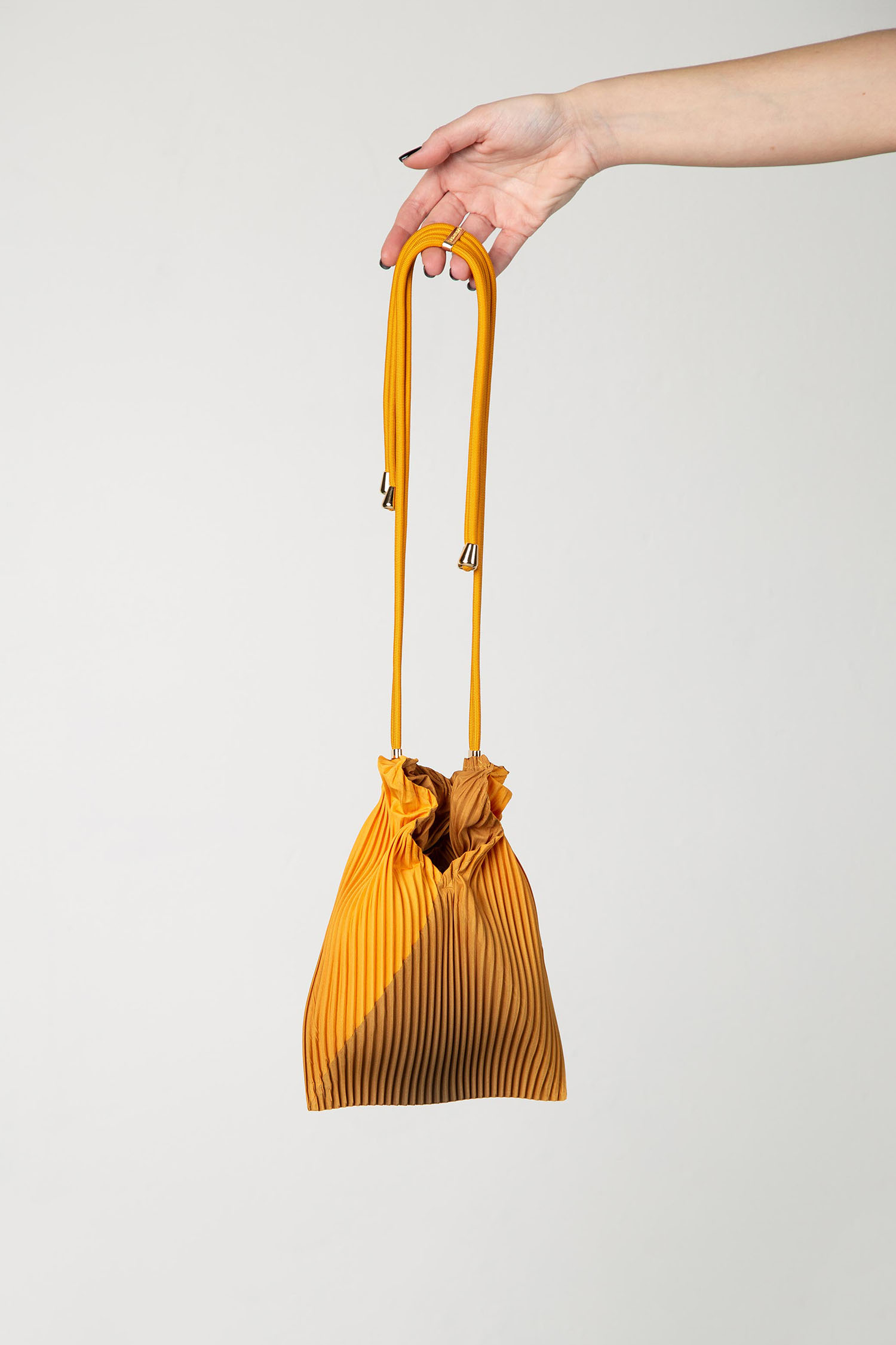Minitasche aus plissiertem Satin mit einem 45 cm langen verstellbaren Schulterriemen.