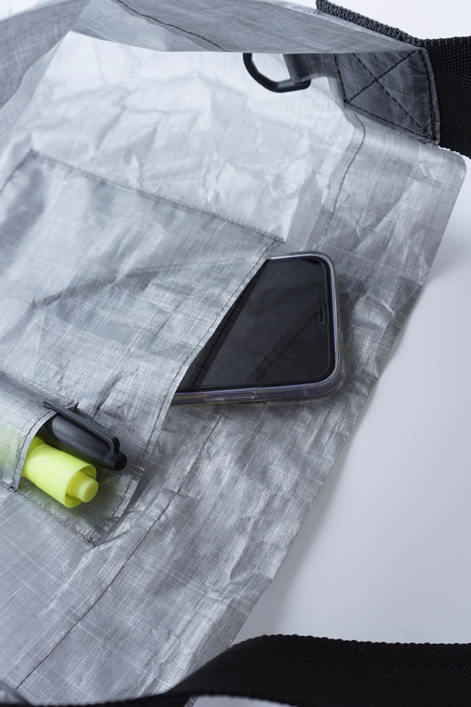DCF (DYNEEMA COMPOSITE FABRIC), commonly known as cuben fibre, is an ultra-thin film-like fabric made of Dyneema fibres laminated with UV resin. Dyneema is a lightweight but extremely tough polyethylene fibre. On a weight basis, it is 15 times stronger than steel and is an ultra-lightweight fibre used in bulletproof vests. DCF is a material with a firmness that wrinkles and softens as it is used. Due to the characteristics of the material, there are natural creases.