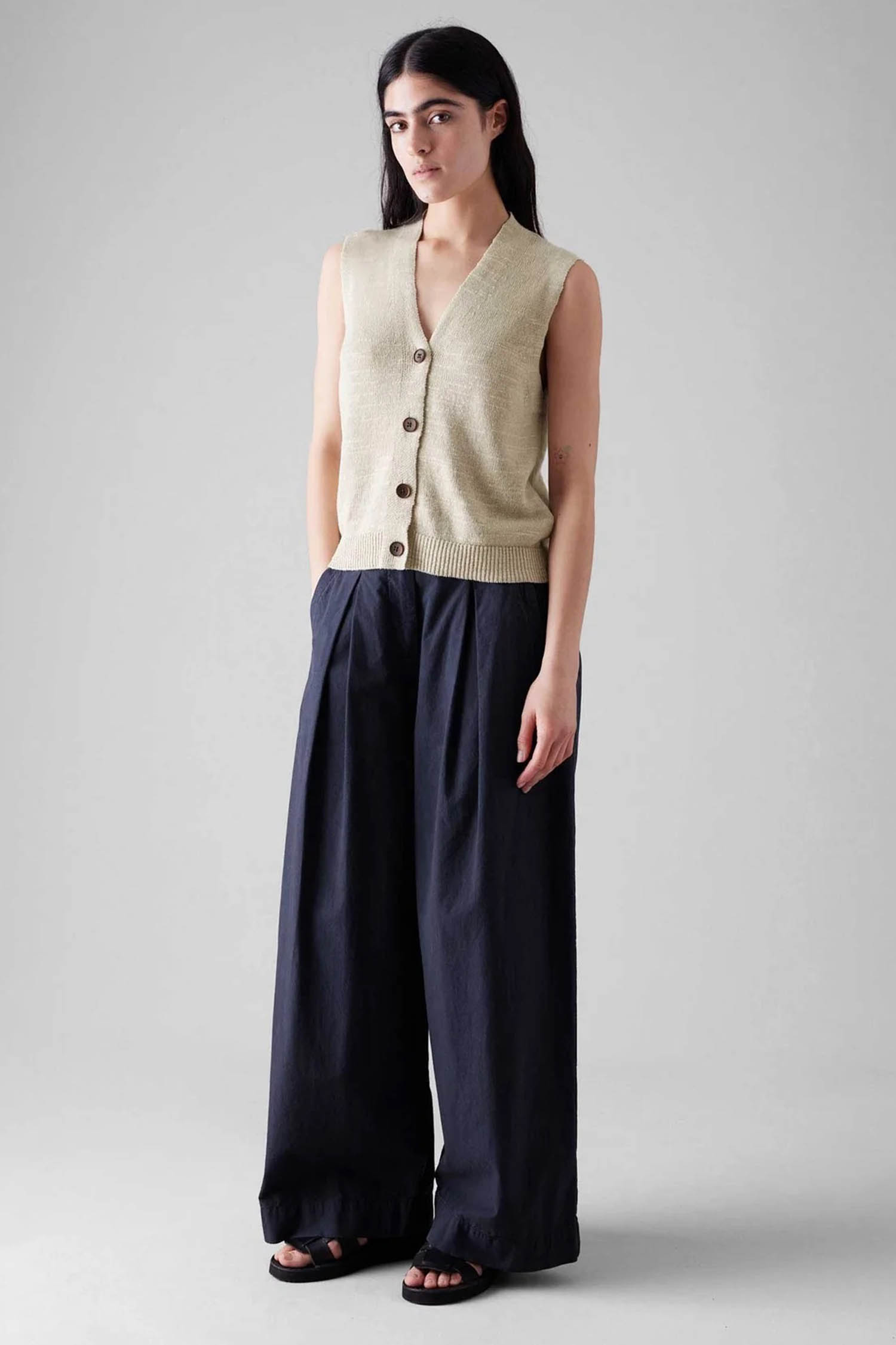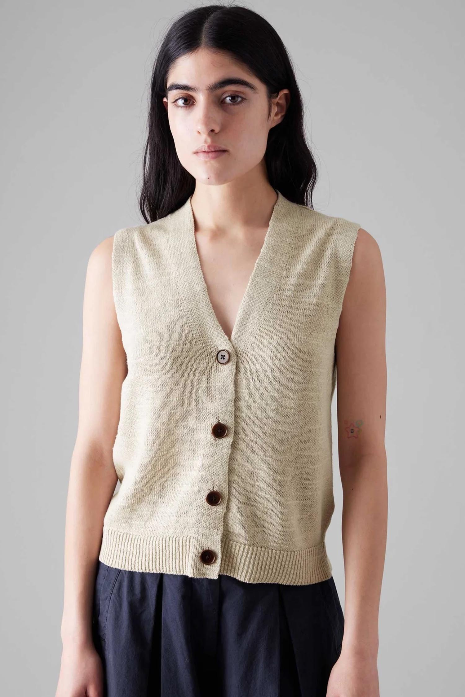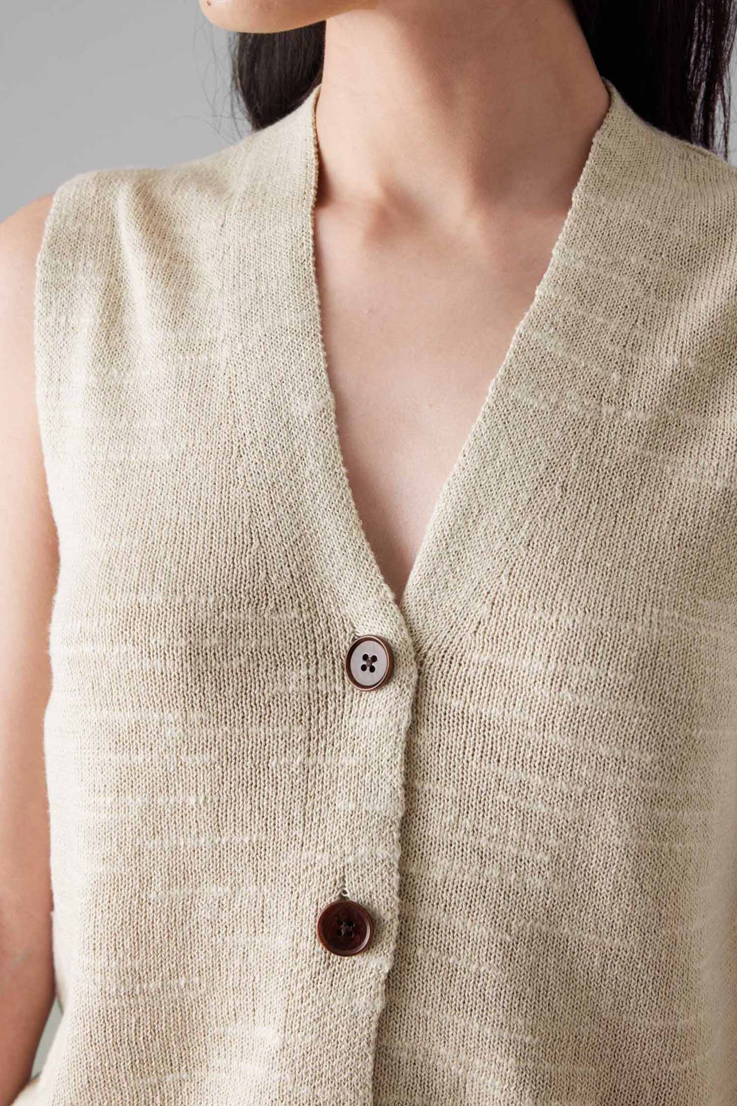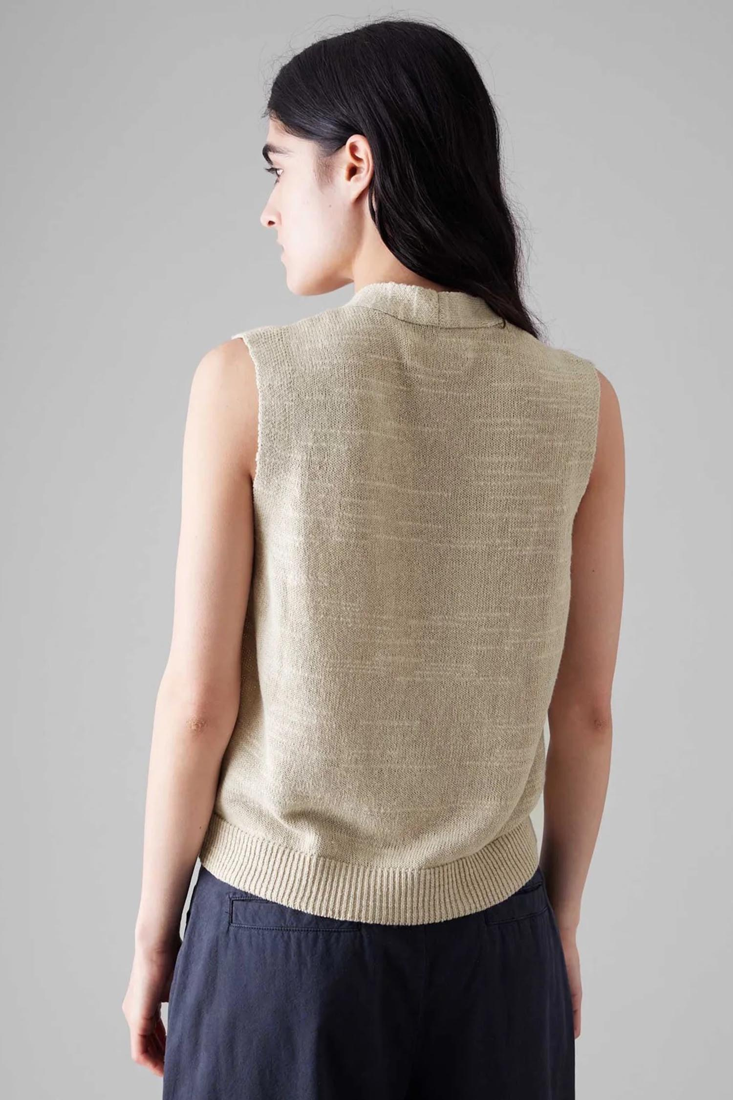 Das lässige Tanktop besteht aus einem angenehm leichtem, strukturiertem Leinen-Baumwoll-Mix und hat einen V-Ausschnitt, der mit Corozo-Knöpfen und einem gerippten Saum abgerundet wird. Es bietet eine bequeme Passform und eignet sich perfekt für warme Tage. In der Übergangszeit lässt es sich einfach kombinieren.