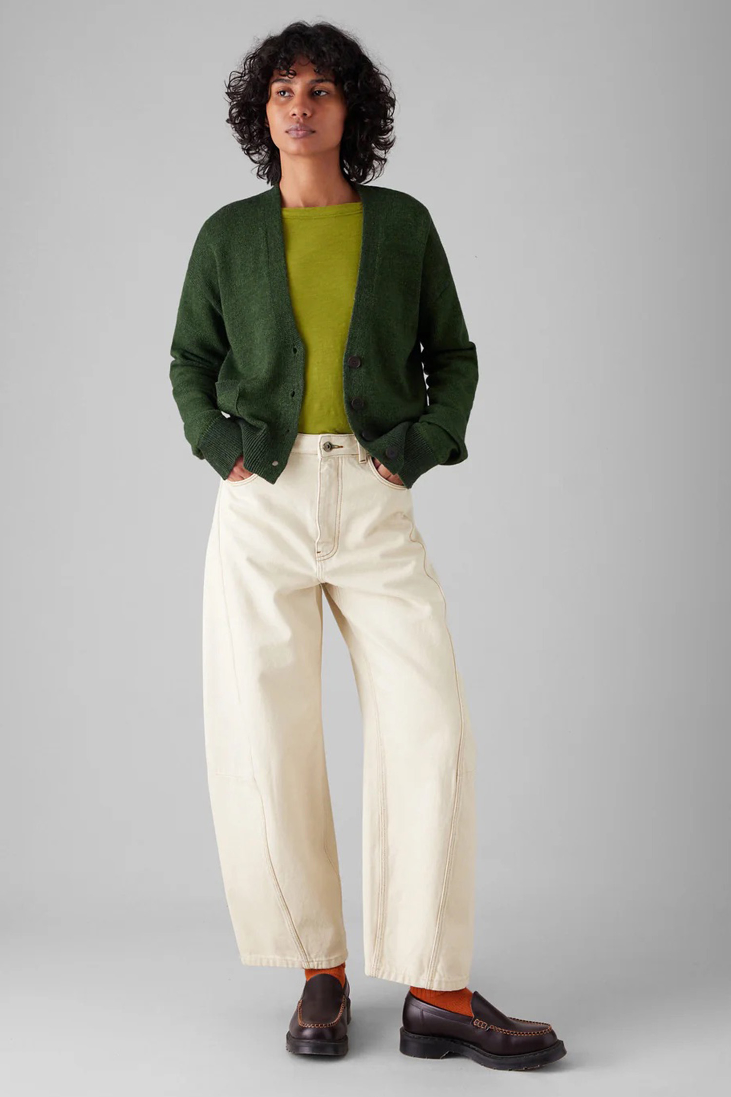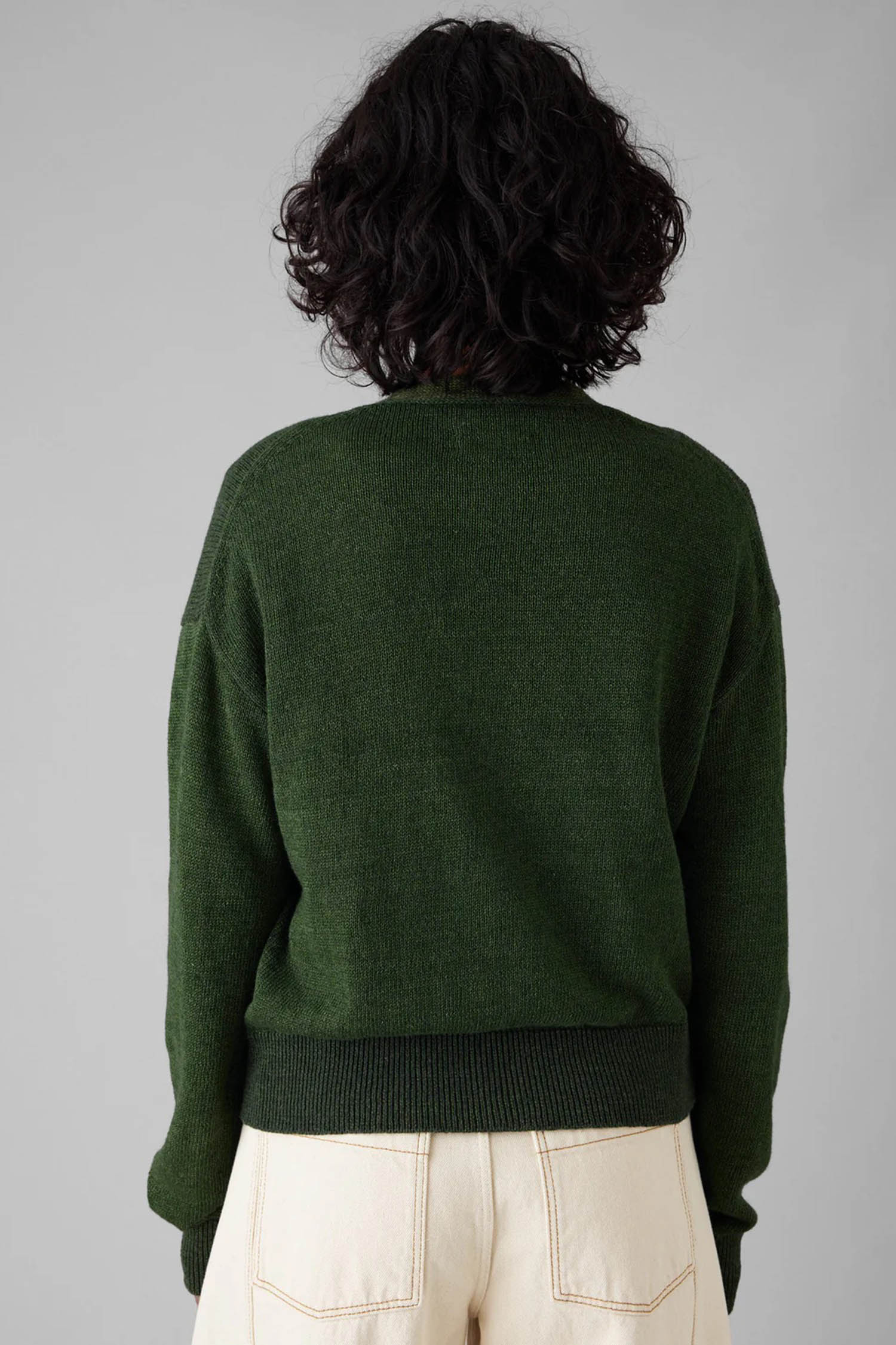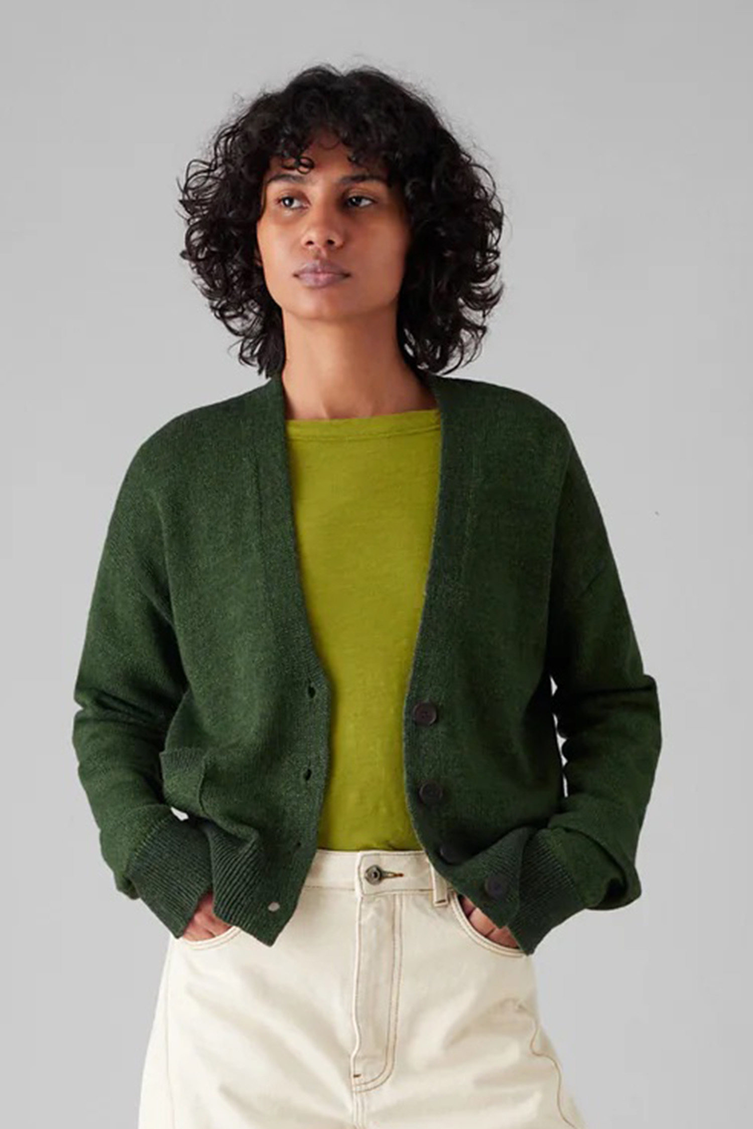 Eine weiche Strickjacke aus einer Mischung von Merinowolle und Leinen, wobei das Leinen aussen verarbeitet ist und so für eine feine Ton-in-Ton-Struktur sorgt. Locker geschnitten mit V-Ausschnitt, aufgesetzter Tasche und breiten Rippbündchen – ideal zum Kombinieren.